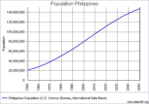 The graph below shows the projected Philippine population in the coming decades as assessed by the U.S. Census Bureau. According to the graph, the Philippine population will be at 150 million in the year 2050. Note that this projection is around 75% of the value projected in Table 1 for the year 2048.