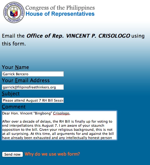 Filipino Freethinkers calls on Filipinos to contact their representatives in Congress to be present on August 7, when the House of Representatives votes to end debate on the Reproductive Health Bill (HB 4244). It is likely that many opposing congressmen will skip work on that day in order to avoid quorum and prevent any congressional procedures. If the period of sponsorship and debate ends on August 7, the bill will enter the period of amendments and, eventually, it will be voted on for third reading before final passage.