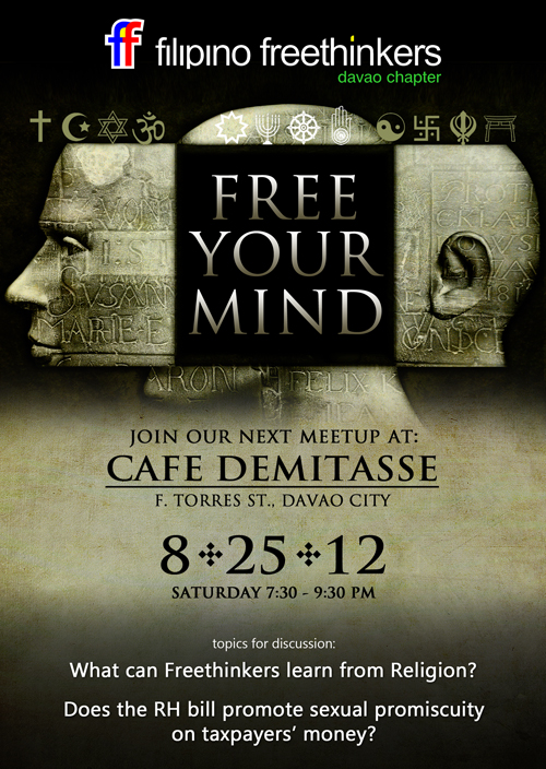 For freethinkers way down south, join us on August 25, 2012 at Cafe Demitasse (http://goo.gl/maps/3nvoD), F. Torres St., Davao City.