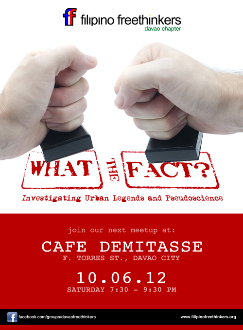 Join us as we explore these issues in “What the Fact? Investigating Urban Legends and Pseudoscience” at the Filipino Freethinkers Davao meetup on October 6, 2012 at Cafe Demitasse, F. Torres St., Davao City (click for map), from 7:30PM to 9:30PM (or later — last time, we had a stimulating discussion that ended at around 12:00 MN).