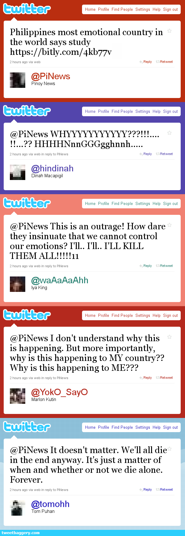 MANILA, Philippines—It was recently discovered that the Philippines is the world’s most emotional country. This has sparked many violent reactions from the Filipino community, most notably from those who drown themselves daily in celebrity drama on television. The following are some tweets that were collected a few hours after the findings were released to the public: