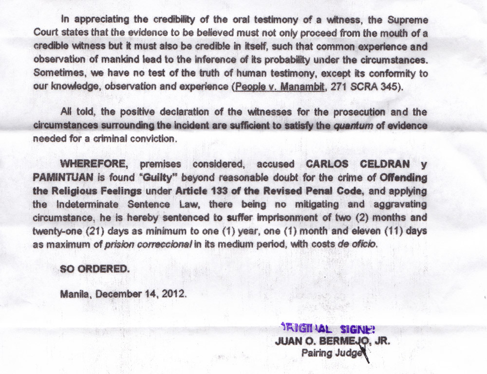 Two years later, after many efforts from the Catholic Bishops Conference of the Philippines’ (CBCP) to shirk and delay the hearings, the Manila court has declared Celdran guilty of the said charge.